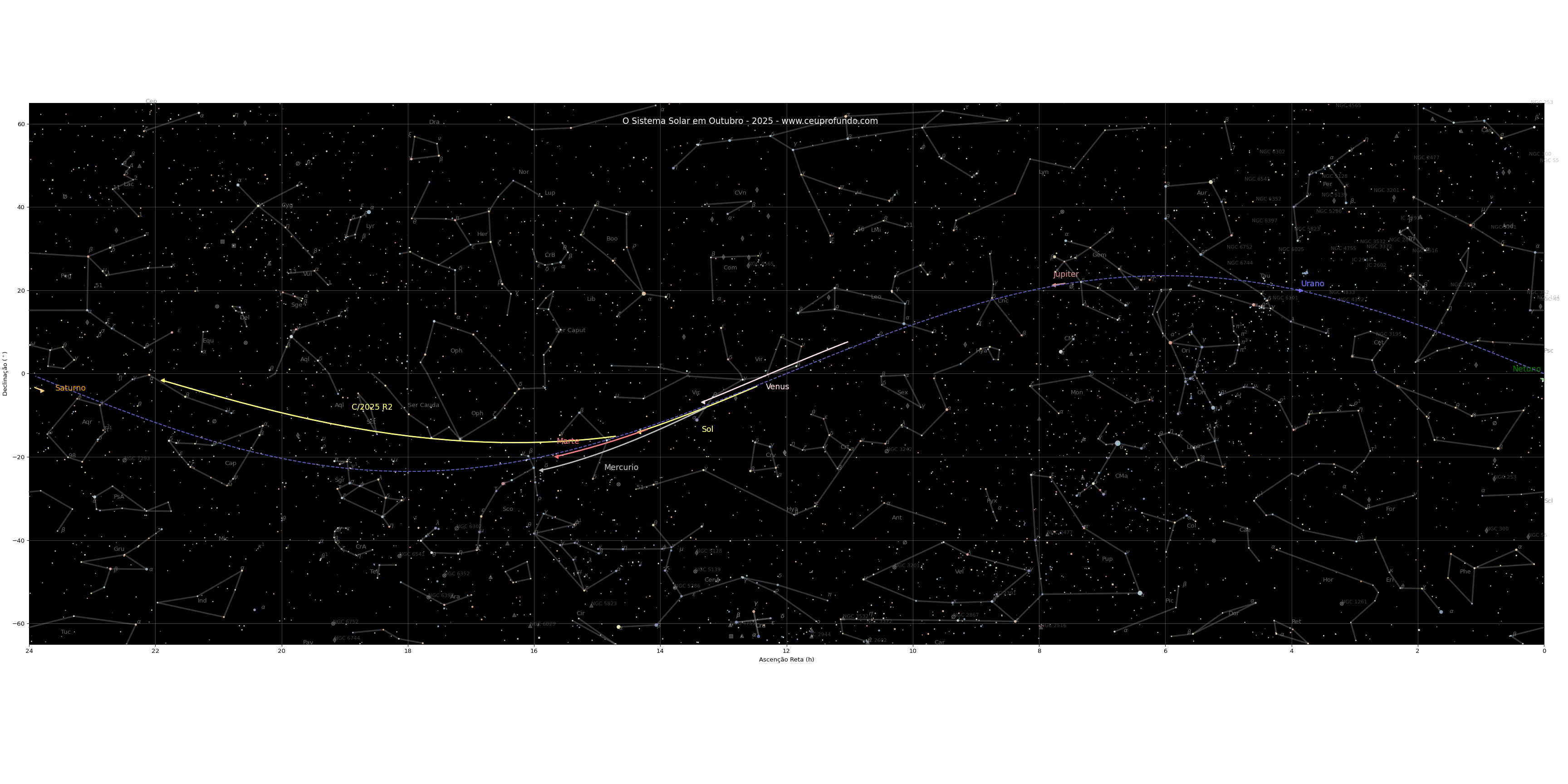 O destaque do céu de Outubro é o cometa C/2025 R2 (SWAN). Apesar de não atingir brilho suficiente para ser visto a olho nu, sua posição favorece a observação com binóculos e telescópios a partir do hemisfério sul.