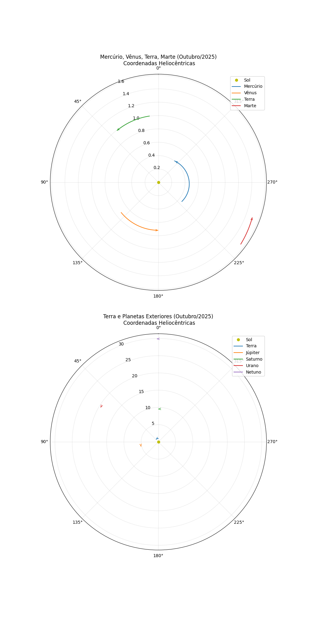 Os diagramas abaixo mostram a configuração dos planetas interiores e exteriores do Sistema Solar ao longo do mês de dezembro, em coordenadas heliocêntricas.